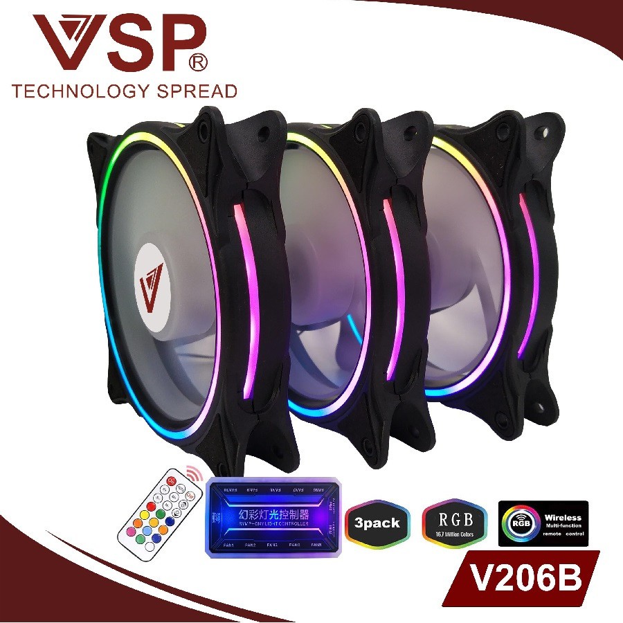 Bộ Kit 3 Fan V206B LED RGB (01 Hộp có 3 Fan /Hub /Remote)Fan VSP Với thiết kế LED nhiều hiệu ứng đẹp mắt, Fan làm mát nhanh chóng, Tăng hiệu năng cho máy tính để bàn, Điều chỉnh từ xa bằng điều khiển ...