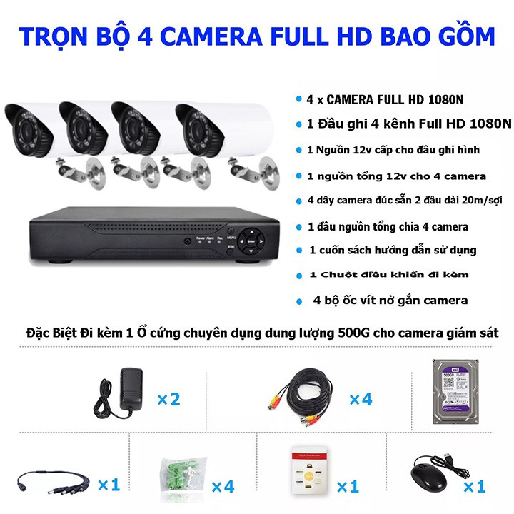 Cameras & Flycam > Camera giám sát > Camera giám sát kết nối internet || [Mã 273ELHA100K0 hoàn 7% đơn 500K] Bộ KIT AHD Full HD - Trọn bộ 4 mắt camera + Đầu ghi kèm ổ cứng HDD 500GCòn hàng