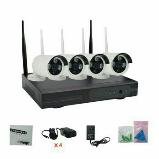 Trọn bộ kit bao gồm 04 camera IP Wifi thân trụ, 01 đầu ghi IP 4 kênh, các phụ kiện đi kèm (nguồn đầu ghi, nguồn camera, dây mạng, ăng-ten).