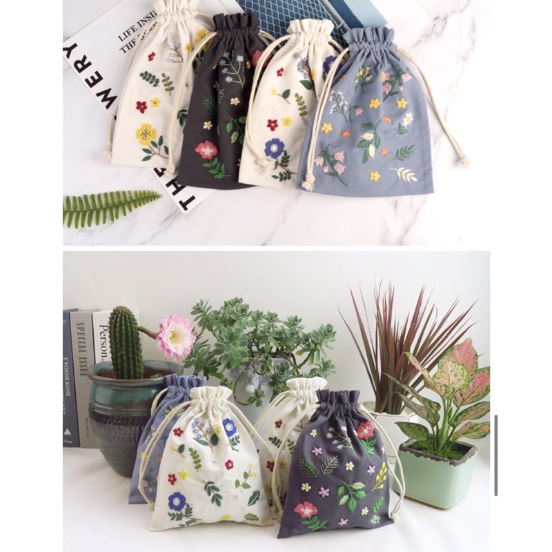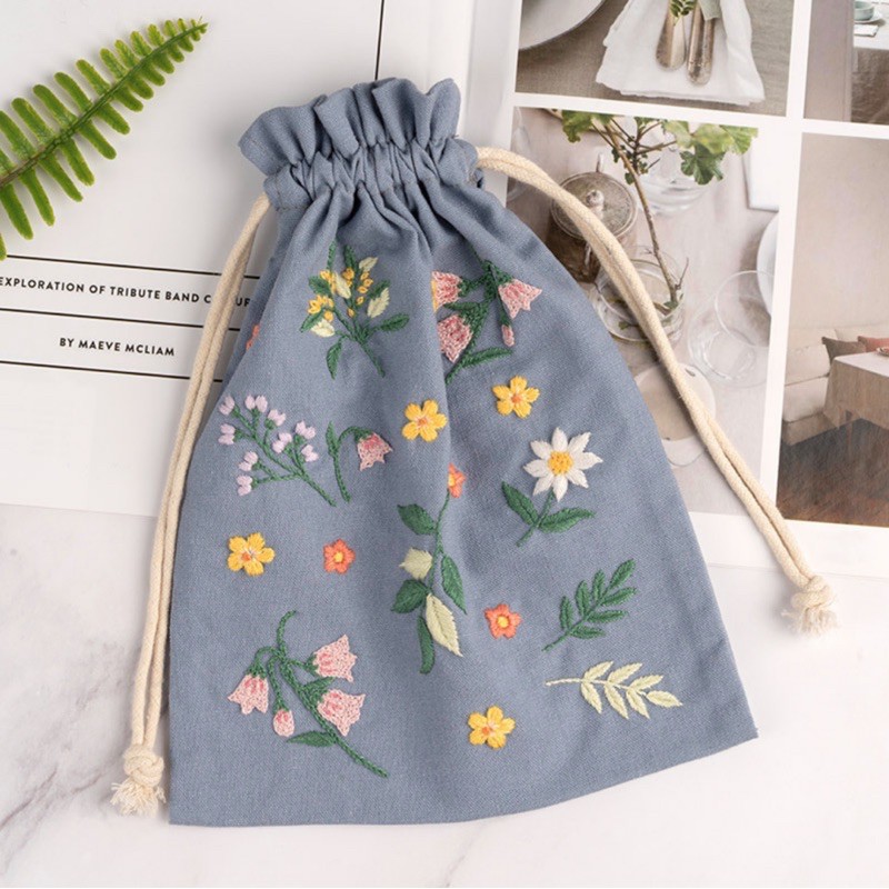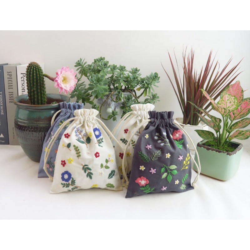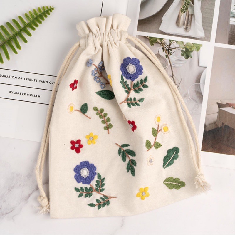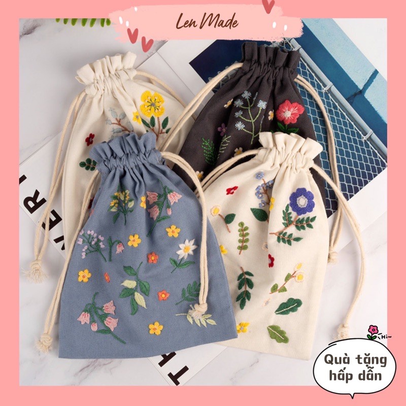 Bộ kit nguyên liệu túi thêu dây rút hoa lá vintage tự thêu đầy đủ handmade sinh viên decor nhà cửa Lenmade