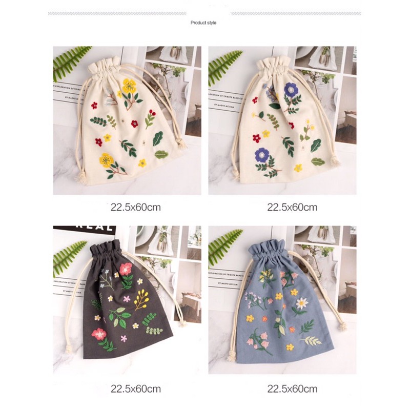 Giới thiệu Bộ kit nguyên liệu túi thêu dây rút hoa lá vintage tự thêu đầy đủ handmade sinh viên decor nhà cửa Lenmade