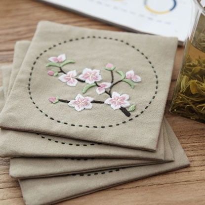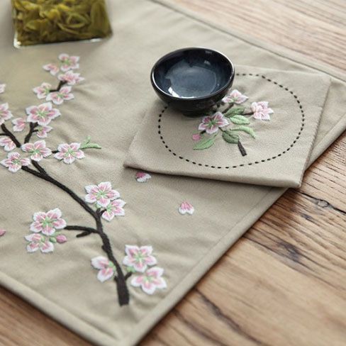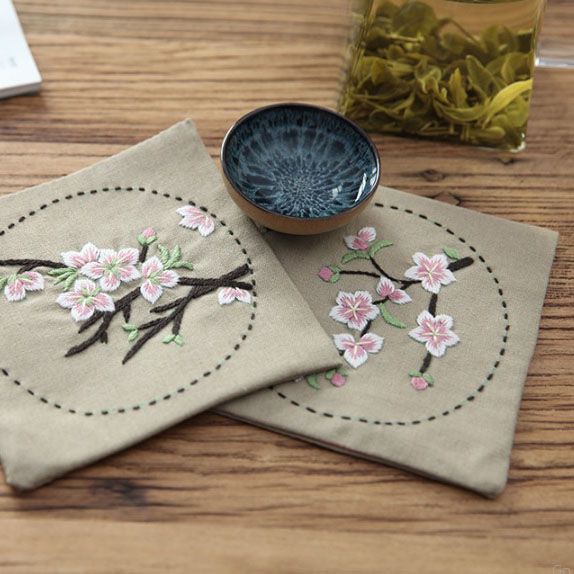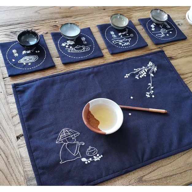 - Vải thêu được cắt và vẽ mẫu sẵn, chất vải thô cotton. Tấm lót bàn kích thước 45,5x30,5cm, 4 tấm lót chén trà kích thước 12,7x12,7cm