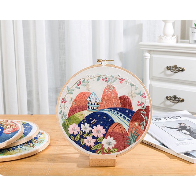 Kit tập thêu tranh phong cảnh vừa để nâng cao kỹ năng thêu thùa, vừa làm tranh xinh xắn treo trong nhà! Kích thước tranh khoảng 20x20cm, tranh gồm các mũi thêu cơ bản, đơn giản, ngay cả người mới tập cũng có thể thêu được.Kit thêu gồm: