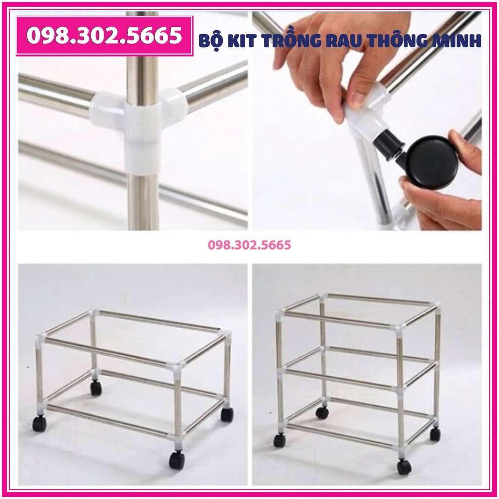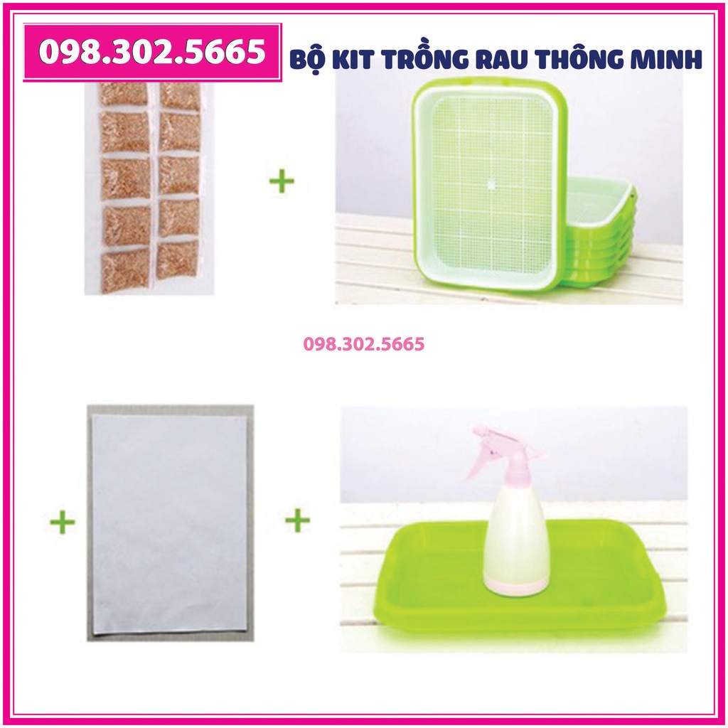 Bộ kít 4 khay, 4 tầng bao gồm: Giá đỡ có 4 bánh + 4 Khay trồng + 200g Hạt giống + Vòi xịt nước.