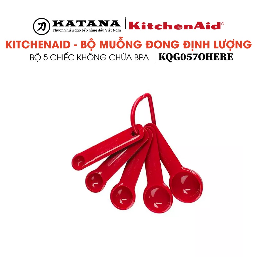 - Bộ muỗng đong KitchenAid có 5 kích cỡ khác nhau được in trên tay cầm: 1 tbsp (15ml), ½ tbsp (7,4ml), 1 tsp (5ml), ½ tsp (2,5ml), and ¼ tsp (1,25ml). Muỗng có thể đong được với cả nguyên liệu dạng lỏng và khô.