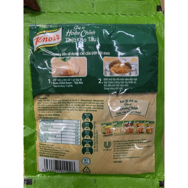 Hạt Nêm Knorr Gia Vị Hoàn Chỉnh Thịt Kho Tàu (28g) - Món Thịt Kho Tàu thơm ngon đến từng thớ thịt nay thật dễ dàng vì đã có Knorr Gia vị Hoàn Chỉnh Thịt Kho Tàu. Mỗi gói nhỏ chứa đường thắng vàng nâu đúng độ & đầy đủ các gia vị cần thiết, được phối trộn với một tỷ lệ hoàn hảo, giúp cho bạn có thể nấu được món thịt kho ngon đúng điệu đãi cả nhà.
