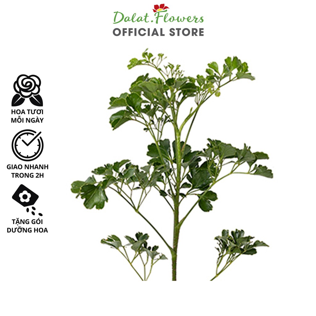 Lá đinh lăng dùng để cắm hoa là một loại lá thuộc chi Đinh lăng (Polyscias) của họ Cuồng cuồng (Araliaceae). Chi đinh lăng có rất nhiều hình thái lá nhưng thường được sử là loại lá xanh có xẻ 3 nhánh con, răng cưa và gai nhuyễn hoặc hoặc loại lá đinh lăng trắng có viền bạc đẹp mắt. Đinh lăng là một trong những loại lá đệm cắm hoa rất hay được sử dụng vì số lượng nhiều có quanh năm, dễ mua dễ tìm và độ che phủ xốp hoặc tạo độ phồng cho bó rất tốt.QUY CÁCH SẢN PHẨM: