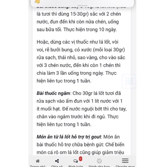 Dùng 12g lá lốt, 12g bạch truật, 12g lệ chi, 10g bạch linh, 10g trần bì, 21g sinh khương, 6g phòng sâm, 6g sơn thù, 5g hoàn kỳ, 4g cam thảo (chích). Sắc với 600ml nước còn 200ml, chia ra uống nhiều lần tr
