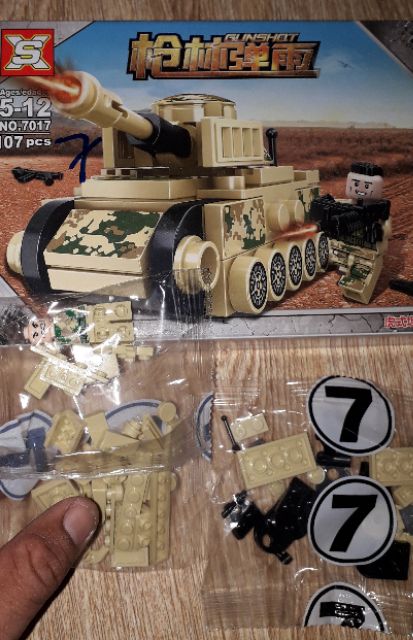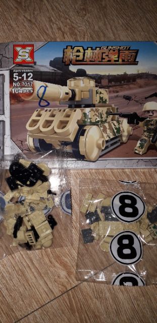 Sản phẩm là 1 hộp lắp ráp LegoXe tăng 7017 có nhiều chi tiết bằng nhựa rất đẹp như hình.Sản phẩm có 8 mẫu khác nhau và màu sắc khác như hình. Mỗi mẫu được đánh số trên từng hộp như hình. Sản phẩm là lắp ráp kết hợp thành mô hình lớn hơn và đẹp hơn khi mua trọn bộ 8 hộp.