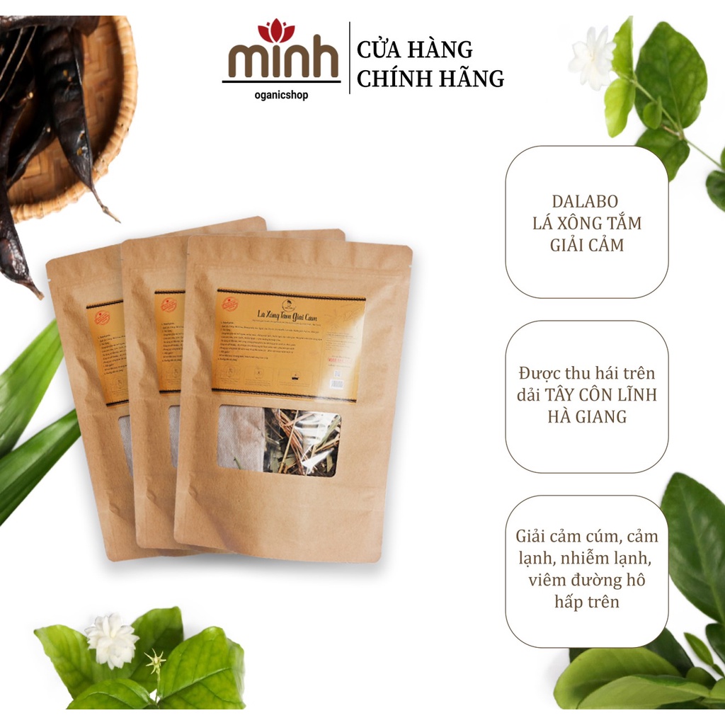 DALABO - LÁ XÔNG TẮM GIẢI CẢMThành phần: Quế chi, Gừng, Hồi hoa,Hương nhu tím, Ngải cứu, Tía tô, Sả chanh, Cúc tần, Kinh giới, Lá tre, Mùi già.