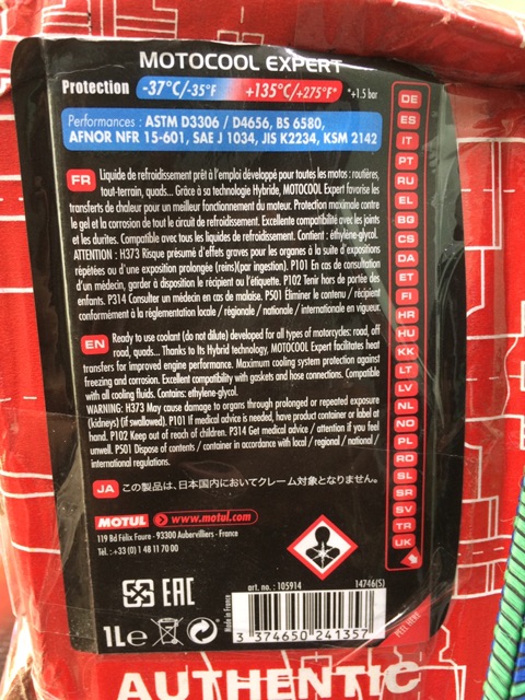 Nước làm mát thương hiệu Motul nổi tiếng, đúng như tên gọi là “nước làm mát” dung dịch nước làm mát Motul Motocool Expert có công dụng làm mát động cơ xe máy giúp xe được giải nhiệt, không bị các hiện tượng như ỳ máy, nóng máy… Motul đã cho ra đời dung dịch làm mát Motul Motocool Expert sử dụng kỹ thuật làm mát bằng dung dịch với nhiều ưu điểm vượt trội.