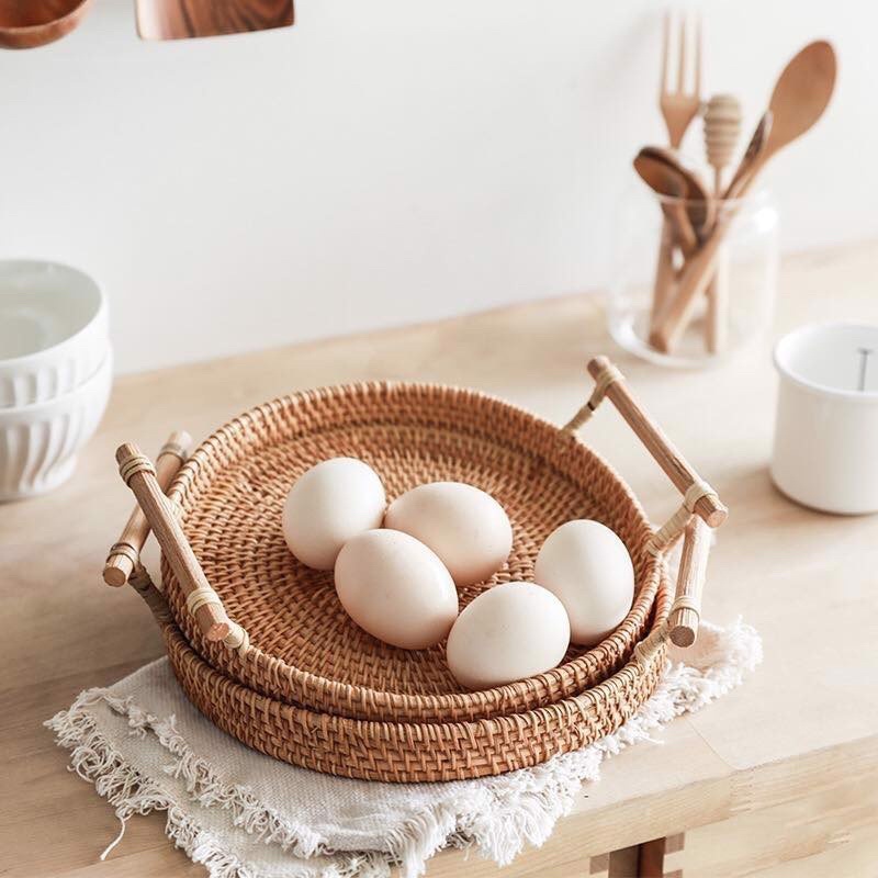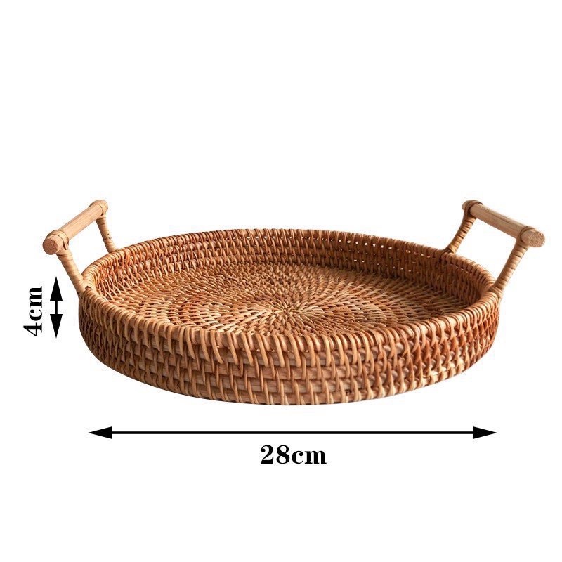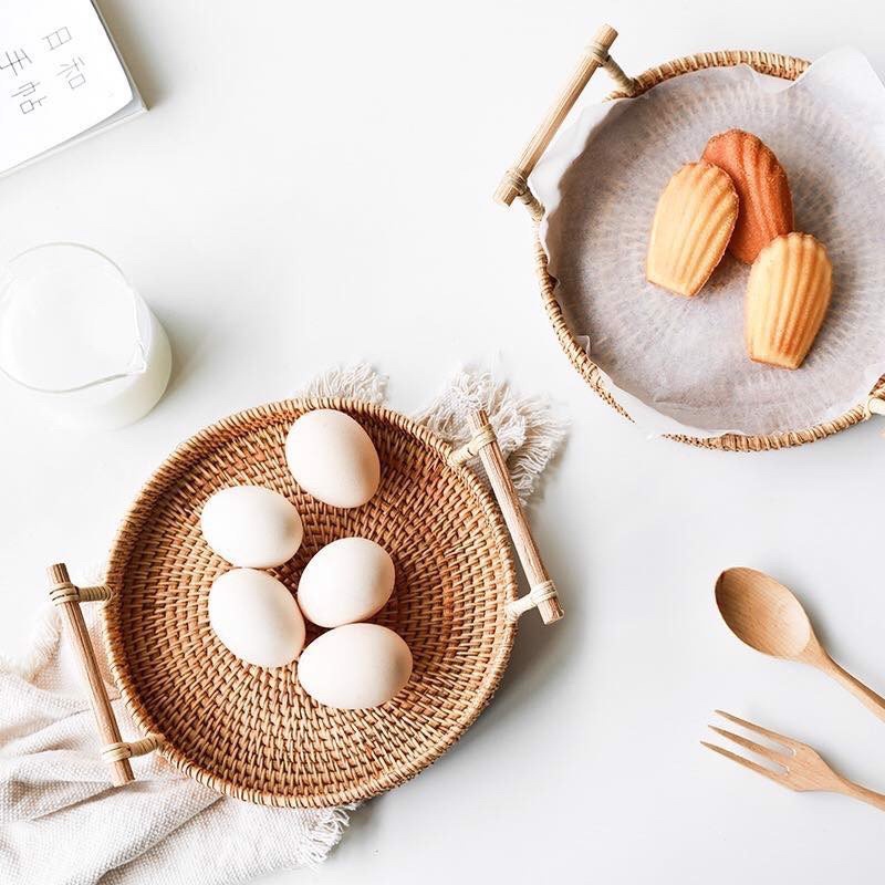 Khay mây tròn 3 kích thước có tay cầm decor chụp ảnh, Đĩa mây đựng đồ trang trí