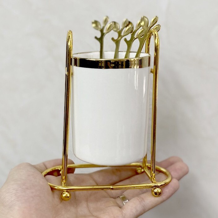 Gồm ống đựng muỗng nĩa bằng sứ - thủy tinh có khung bao bên ngoài mạ vàng có thể xoay 360 độKích thước:
