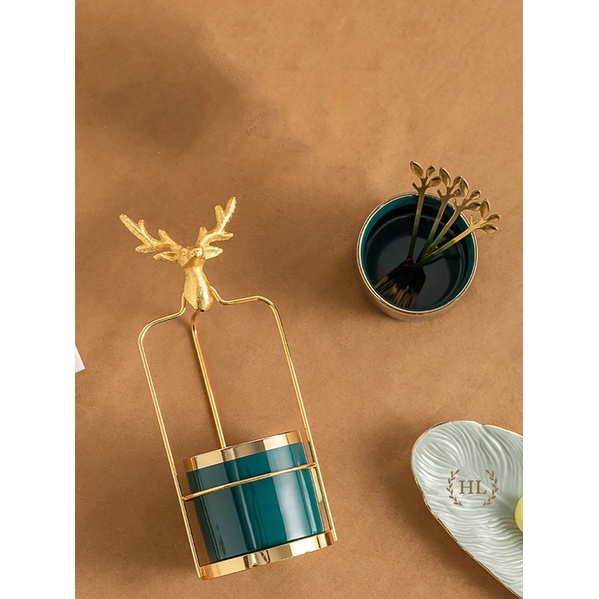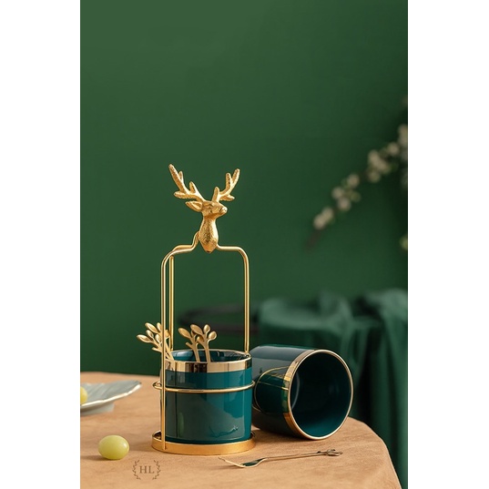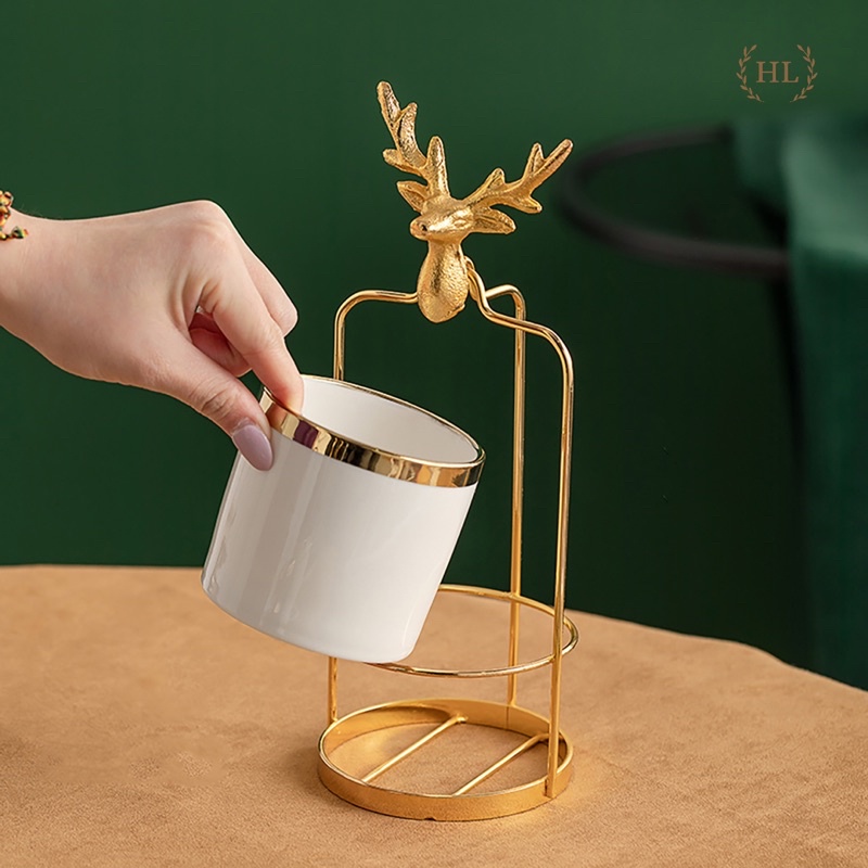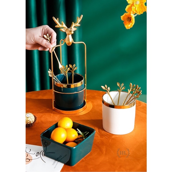 Gồm ống đựng muỗng nĩa bằng sứ có khung bao bên ngoài mạ vàng tạo hình đầu hươu cao cấpKích thước: