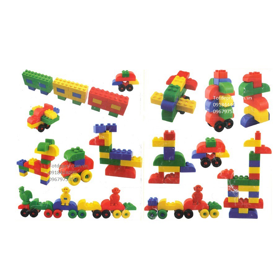 Đồ chơi ghép hình khối - kiểu viên gạchBộ sản phẩm gồm 54 chi tiết, gồm những miếng ghép hình chữ nhật các răng ăn khớp hình tròn, các bánh xe.
