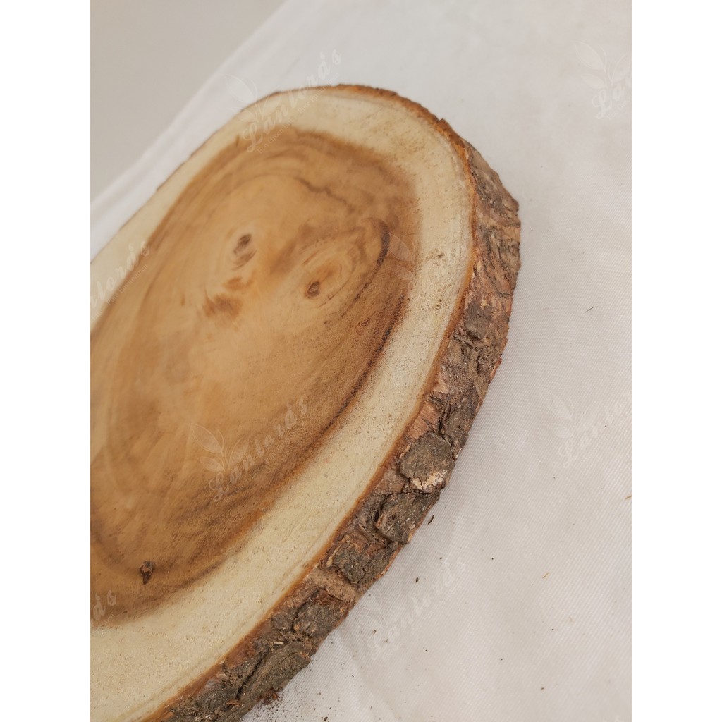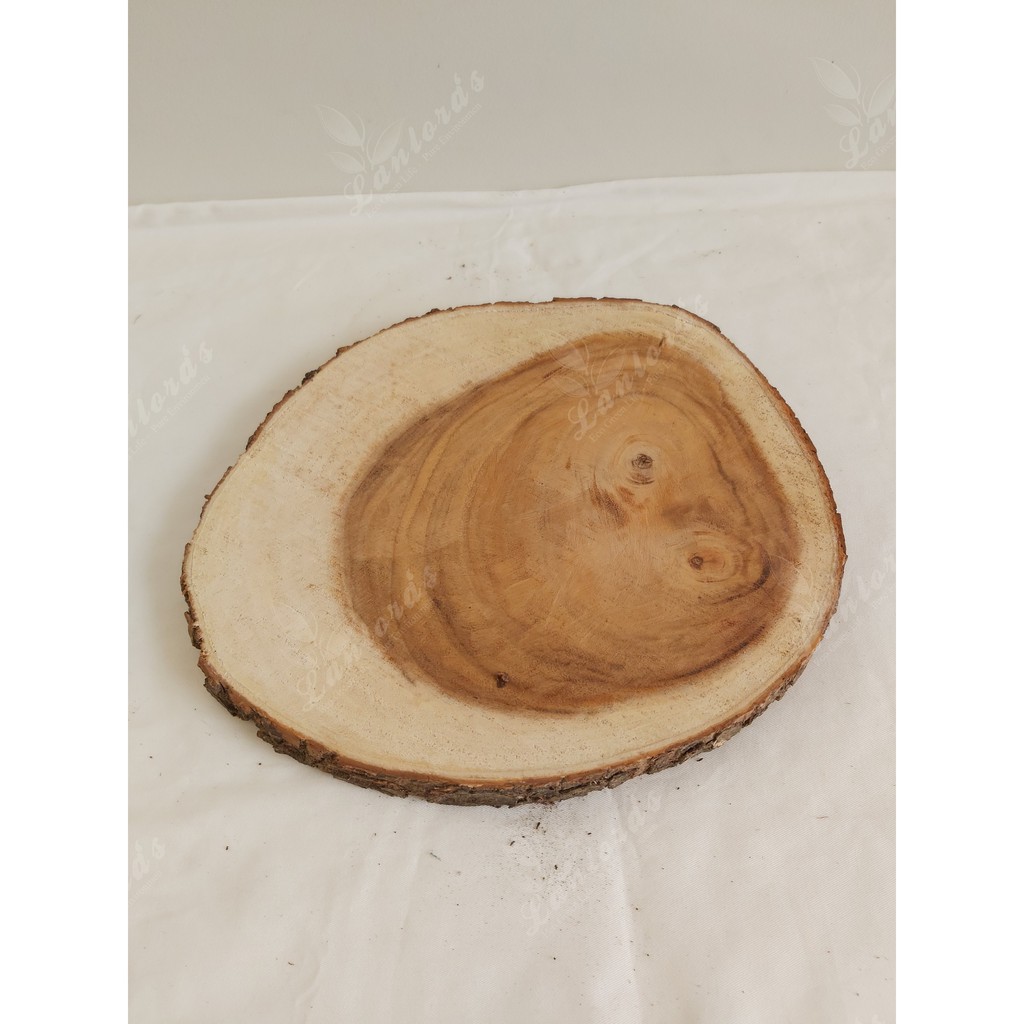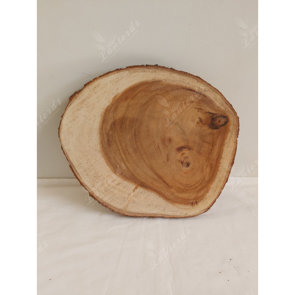 Khoanh gỗ tự nhiên được cắt lát từ gỗ me tây nguyên khối, còn nguyên vẹn lớp vỏ ngoài, mang tính thẩm mỹ cao, gỗ được bào nhẵn, lộ rõ vân đẹp mắt.** Ứng dụng: làm tranh handmade, làm mặt đồng hồ treo tường, khay trang trí, decor giáng sinh, noel, hoặc làm mặt đôn để chậu cây.