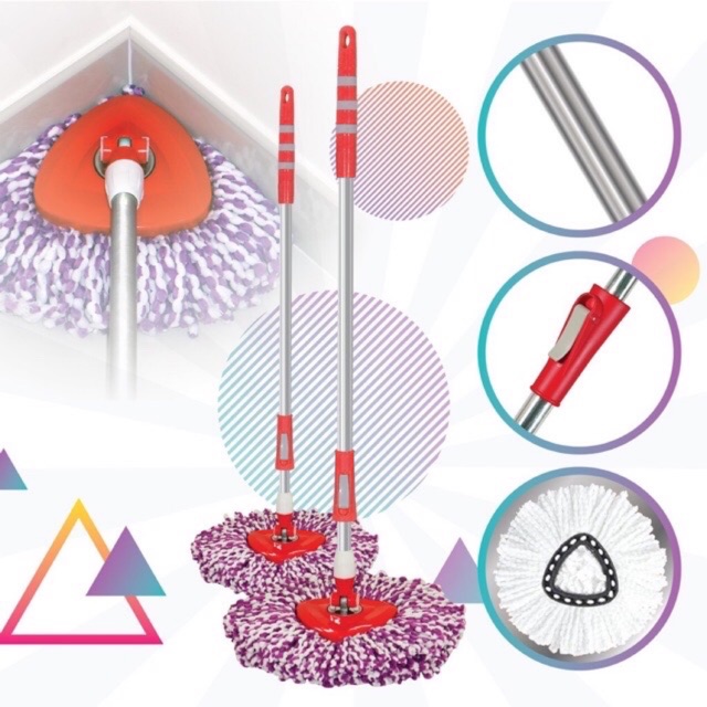 -Đầu lau xoay 360 độ với mâm nhựa PP cao cấp, chịu va đập tốt, được thiết kế hình tam giác ba cạnh, hỗ trợ lau dọn các góc cạnh nhanh chóng và dễ dàng. Khớp xoay giúp cây lau có thể đứng thằng 90 độ hoặc nằm ngang 180 độ, thuận tiện đưa đầu lau đến những vị trí cao ngoài tầm tay hay sàn thấp sát mặt đất.