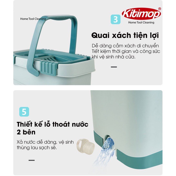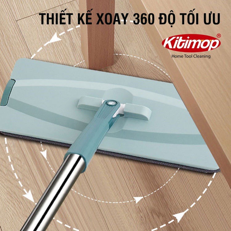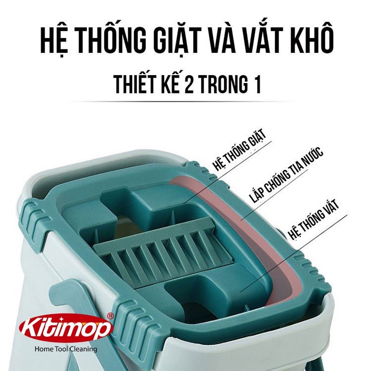 - Kitimop-S1 được thiết kế thông minh với thùng vắt 2 ngăn: 1 ngăn giặt và 1 ngăn vắt giúp làm sạch cây lau nhà nhẹ nhàng mà không cần đụng tay vào. Cây lau sàn phẳng chất liệu inox chắc chắn, bàn lau đa năng xoay 360 độ di chuyển linh hoạt vào những vị trí như gầm tủ, gầm ghế, góc hẹp.