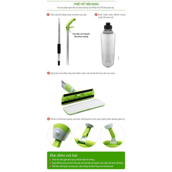 - Cây lau nhà phun nước thiết kế gọn, nhẹ, đẹp mắt ứng dụng từ công nghệ Mỹ.
