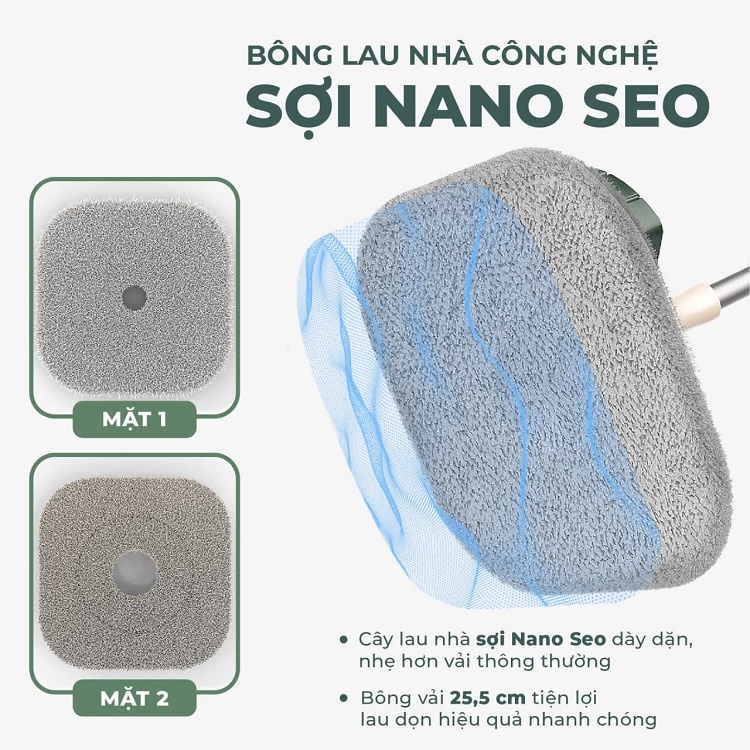 SẢN PHẨM TIỆN DỤNG CÂY LAU NHÀ THÔNG MINH SMART NANO F12Cây lau nhà SMART NANO F12 có cấu tạo thông minh với đầu lau xoay 360 độ linh hoạt, bông lau Nano mềm mại, thấm hút tốt cho tốc độ làm sạch sàn nhanh, sàn nhà được làm khô nhanh chóng.