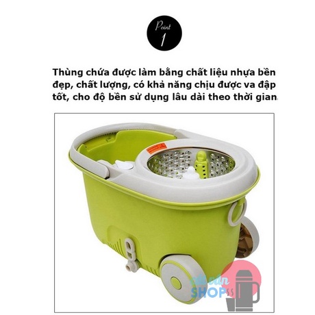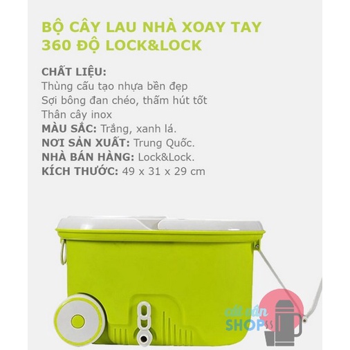 Bộ cây lau nhà xoay tay 360 độ Lock&Lock MOP-L003 (Xanh lá cây) gồm 1 thùng chứa nước, 2 bông lau cùng 1 cây lau, sẽ góp phần giúp bạn giữ cho nhà cửa luôn được sạch sẽ và khô thoáng.