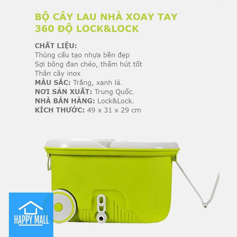Bộ cây lau nhà xoay tay 360 độ Lock&Lock MOP-L003 (Xanh lá cây) gồm 1 thùng chứa nước, 2 bông lau cùng 1 cây lau, sẽ góp phần giúp bạn giữ cho nhà cửa luôn được sạch sẽ và khô thoáng.