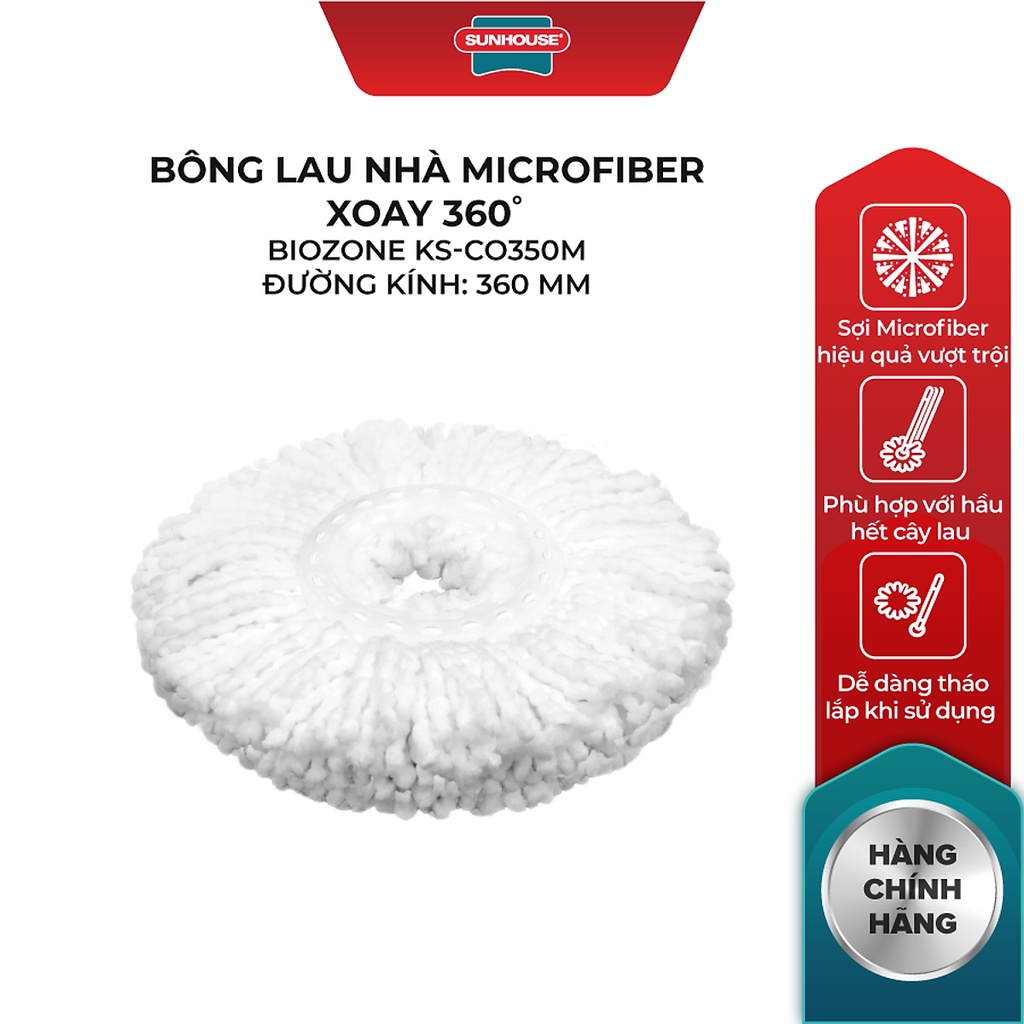 Bông Lau Nhà Microfiber Xoay 360 Độ Sunhouse KS-CO350M bao gồm những sợi bông gắn vào 1 đĩa bằng nhựa PP siêu bền. Đĩa nhựa này có kích thước Ø157 mm và đường kính bông lau Ø380 mm thích hợp với phần lớn các cây lau nhà 360 độ, giúp bạn có thể dễ dàng lắp đặt và sử dụng.Bông lau nhà Microfiber xoay 360 độ SUNHOUSE KS-CO350M chất liệu sợi Microfiber cao cấp có khả năng thấm nước cao gấp 7 lần và nhanh khô hơn gấp 3 lần so với các loại bông lau thông thường khác, làm tăng độ bền nên sẽ tiết kiệm hơn.