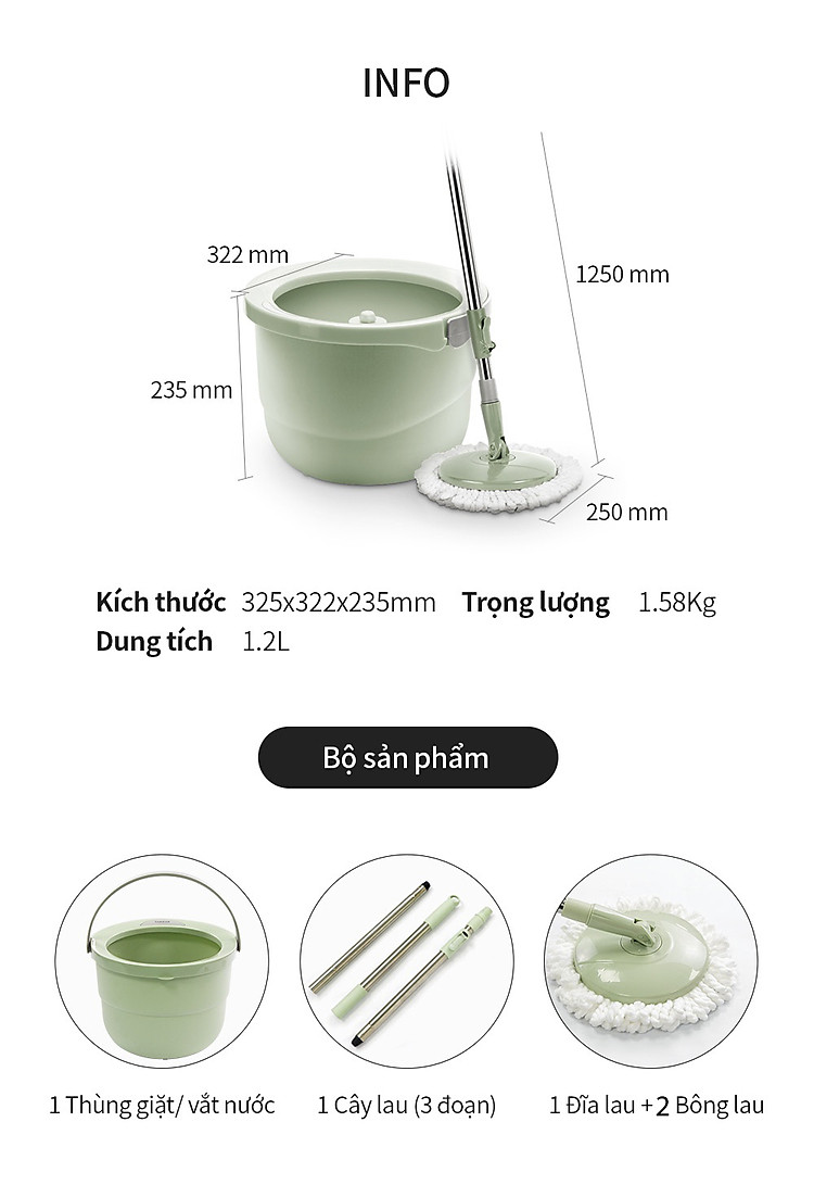 - Kích thước: Thùng giặt: 32,5 x 32,2 x 23,5 (cm); cây lau: 120,5 (cm); bông lau: 25 (cm)