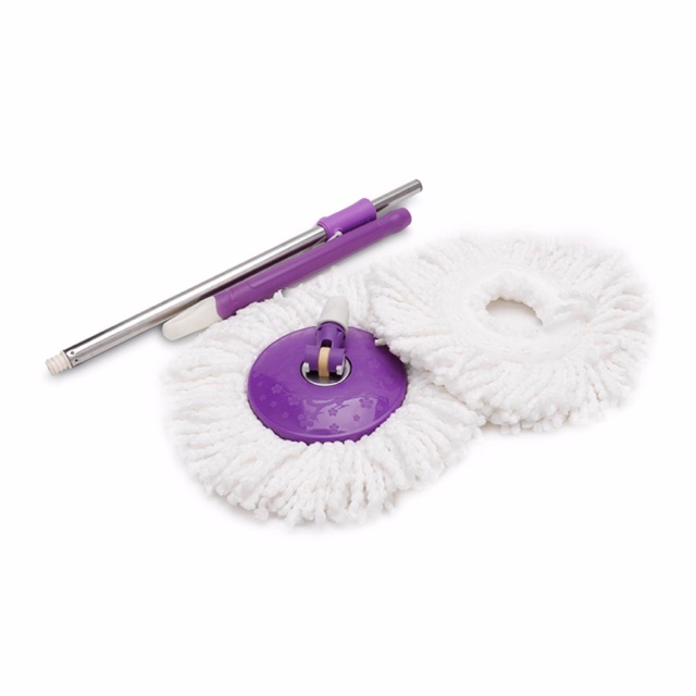 Bộ phụ kiện bao gồm 1 thân cán màu tím dài 120cm, 1 bàn xoay nhựa, và 1 bông lau màu trắng .