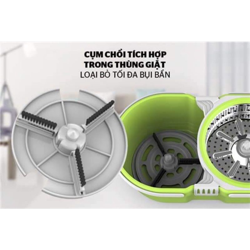 Bên trong thùng giặt có 1 lồng vắt bằng inox chống han gỉ và giúp dễ dàng vắt khô nước của bông lau nhờ cơ chế vắt ly tâm và thiết kế lỗ thoát tiện dụng.