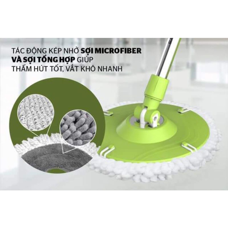 Tấm bông lau làm bằng sợi Microfiber kết hợp cùng sợi tổng hợp thiết kế đan chéo lập thể siêu nhỏ có tác động kép không chỉ giúp thấm hút nước tốt, vắt khô nhanh gấp nhiều lần so với các loại khăn lau thông thường mà còn có tác dụng lau sạch bụi bẩn nhanh chóng nhất. Hệ thống vắt nước tích hợp gọn và tiện lợi, dễ dàng giặt và vắt khô bông lau. Đặc biệt, 2 sợi này có ưu điểm là không bị xơ cứng nên không làm trầy xước bề mặt được lau.
