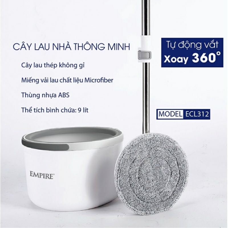 Cây Lau Nhà Empire ECL312 Bộ Lau Nhà Tự Vắt Thông Minh với khả năng lau sạch sàn nhà một cách nhanh chóng và nhẹ nhàng, phù hợp với mọi loại bề mặt sàn như sàn gạch, sàn gỗ, sàn đá, tường ốp gạch và mặt kính, phù hợp với mọi không gian và diện tích nhà ở của bạn.1. ƯU ĐIỂM SẢN PHẨM Cây Lau Nhà Empire ECL312: