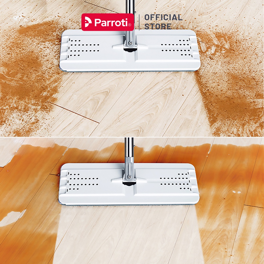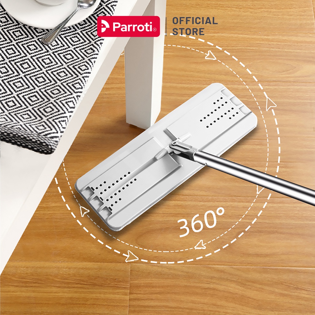 Cây lau nhà thông minh Parroti Pro PR01 có tấm lau to (33 x 12 Cm) sẽ giúp bạn lau sàn nhà rộng hơn với thời gian nhanh hơn. Đồng thời tấm lau bằng phẳng và nhẹ nhàng, lau khỏe hơn, không nặng nề như chổi lau nhà 360 độ. Cán cầm của cây lau nhà Parroti làm bằng xốp mềm, bạn cầm lâu không bị đau tay. Điều đặc biệt là Parroti Pro có thể xoay 360 độ, có thể lau được góc tường, gầm tủ một cách dễ dàng.