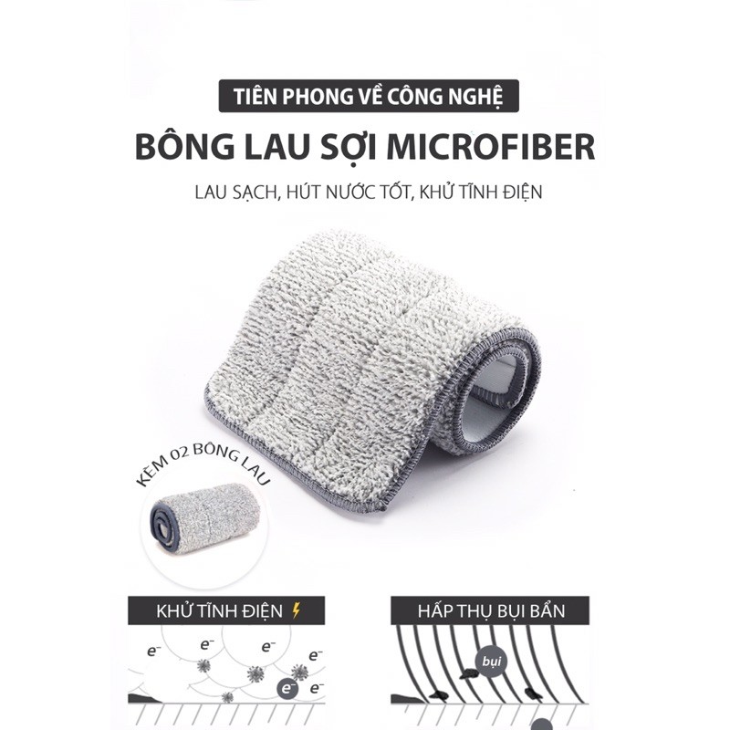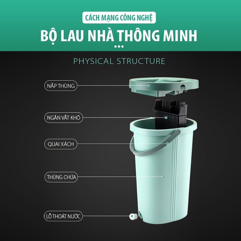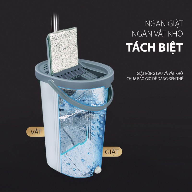 - Thùng 2 ngăn : 1 ngăn vắt khô tự động - 1 ngăn chứa nước để giặt cây lau
