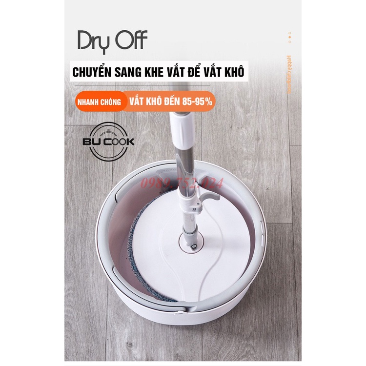 - Cây lau nhà BUCOOK-K8 có thiết kế mới thông minh tiện lợi thùng vắt xoay tròn gồm 1 khe để giặt cây lau và 1 khe để vắt cây lau rất sạch sẽ và tiện lợi. Có thể vắt giẻ lau khô đến 95%, thùng vắt còn thiết kế thêm rang lược để chải sạch bụi bẩn và lông tóc, có lỗ thoát nước thông minh và quai xách tiện lợi giúp cầm xách di chuyển linh hoạt.