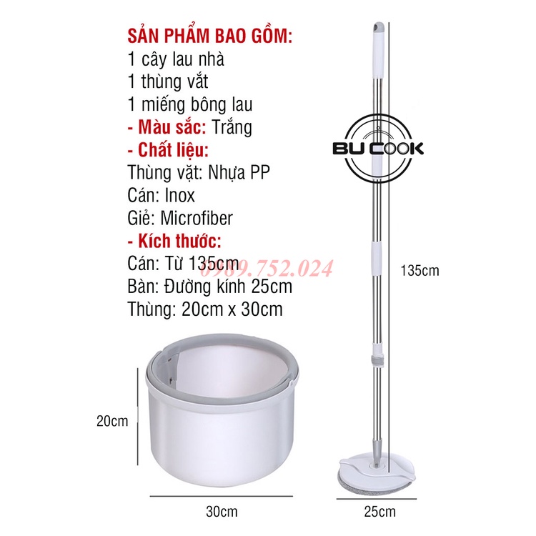 Bộ lau nhà thông minh BUCOOK-K8 thùng vắt xoay tròn nhựa PP, Cán inox dài 134cm, miếng lau 25cm MicrofiberThông tin về sản phẩm: