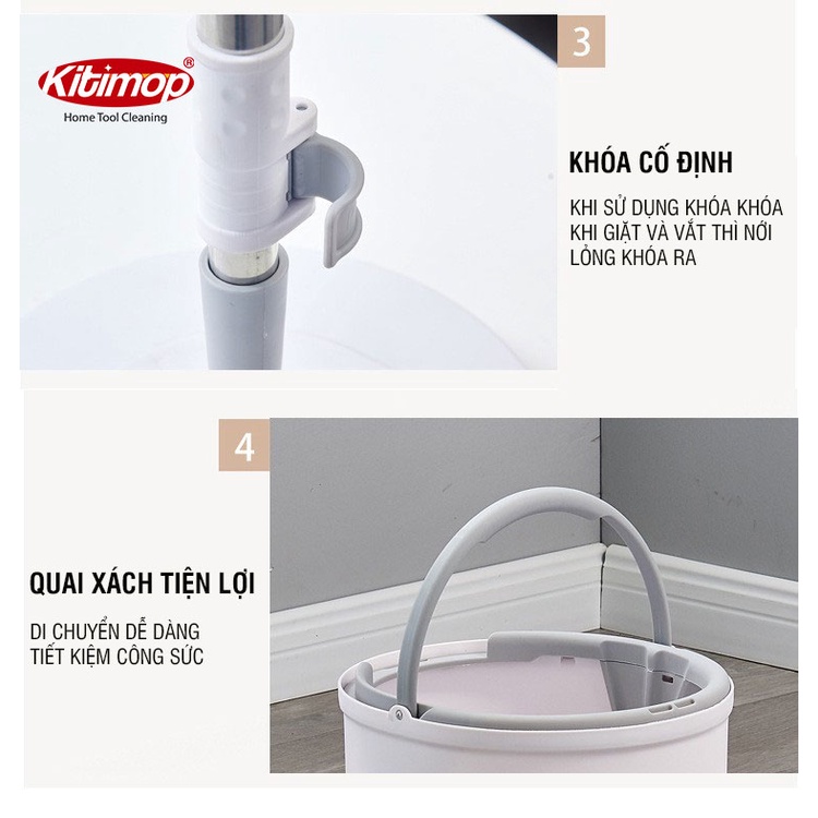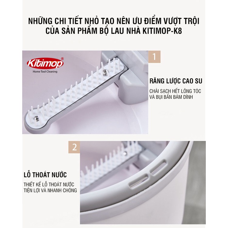 - Cây lau nhà Kitimop-K8 có thiết kế mới thông minh tiện lợi thùng vắt xoay tròn gồm 1 khe để giặt cây lau và 1 khe để vắt cây lau rất sạch sẽ và tiện lợi. Có thể vắt giẻ lau khô đến 95%, thùng vắt còn thiết kế thêm rang lược để chải sạch bụi bẩn và lông tóc, có lỗ thoát nước thông minh và quai xách tiện lợi giúp cầm xách di chuyển linh hoạt.