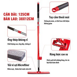 - Bàn lau hình chữ nhật kích thước 38x12cm rộng lớn giúp lau nhà nhanh chóng, hiệu quả nhân đôi. Miếng lau chất liệu Microfiber sợi mịn, thấm hút tốt, có thể hút bụi hút lông tóc làm sạch sàn sáng bóng.
