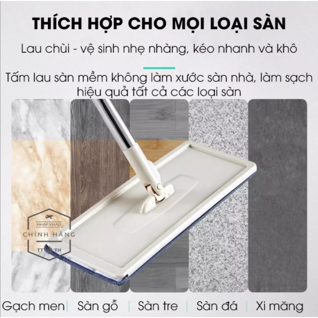- Miếng bông lau được làm bằng vải cotton mềm mại, thấm hút tốt, có diện tích lớn, mang tới tốc độ làm sạch sàn nhanh và sạch, có thể tháo rời để giặt