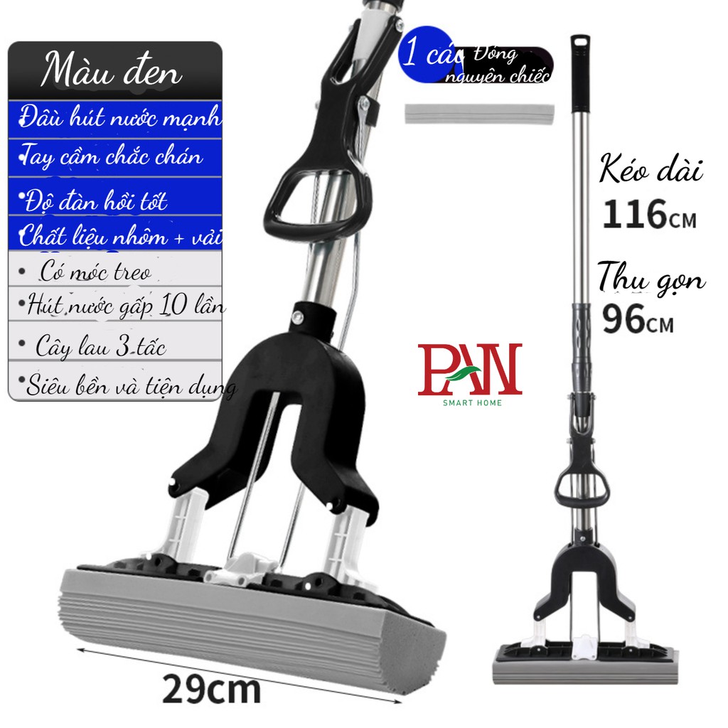 - Cây lau nhà mút 3 tấc với thương hiệu, được thiết kế 2 trục, có thể thay đổi độ dài giúp lau sạch mọi ngóc ngách trên sàn nhà, tường, kính... giúp bạn tiết kiệm thời gian và công sức khi lau dọn nhà cửa.