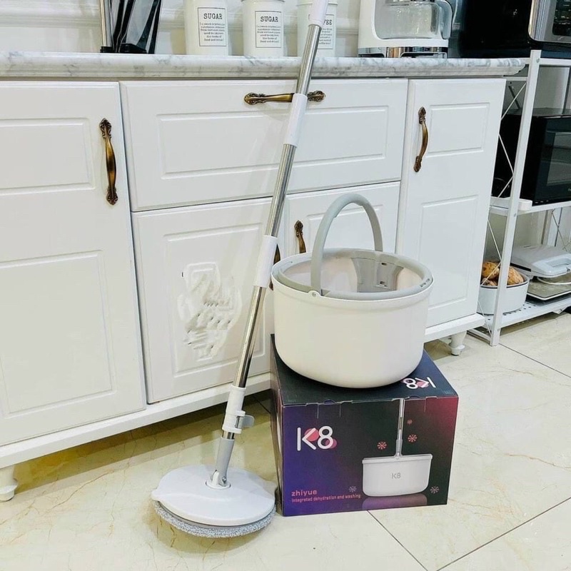 Tên sản phẩm: Bộ Lau Nhà K8 Thông Minh Có Thùng Vắt Xoay Tròn Nhựa PP, Cán Inox Dài 134cm, 2 Miếng lau 25cmChất liệu: Nhựa PP + Cán nhôm inox + miếng lau microfiber