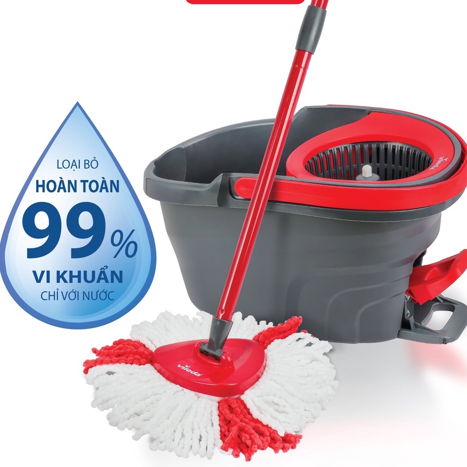 Bộ cây lau nhà cao cấp Vileda Turbo Easy Wring&Clean là sự kết hợp giữa cây lau sợi microfiber và một chiếc xô với bộ vắt vận hành bằng bàn đạp chân được sử dụng để vắt dễ dàng và làm sạch sàn nhanh hơn.