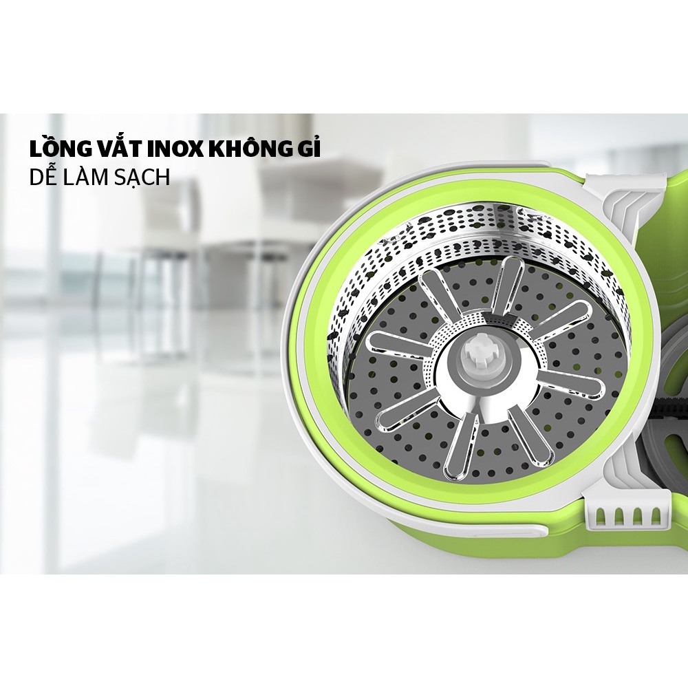 Bên trong thùng giặt có 1 lồng vắt bằng inox chống han gỉ và giúp dễ dàng vắt khô nước của bông lau nhờ cơ chế vắt ly tâm và thiết kế lỗ thoát tiện dụng.