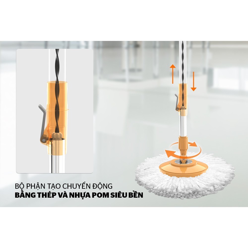 Cây lau nhà xoay 360 độ SUNHOUSE KS-MO350I được thiết kế bộ chuyển động với thanh dẫn động bằng thép hợp kim và cơ cấu tạo chuyển động bằng nhựa POM chống mài mòn tốt, tạo chuyển động nhẹ nhàng, giúp bạn không cần tốn quá nhiều công sức để giặt hay vắt. Bạn chỉ cần đặt cây lau đúng vị trí và nhấn theo theo chiều thẳng đứng là có thể dễ dàng giặt hoặc vắt bông lau. Bên cạnh đó, hệ thống giảm chấn động bằng cao su giúp tăng độ bền của sản phẩm, với thao tác vắt lên tới 60.000 lần.