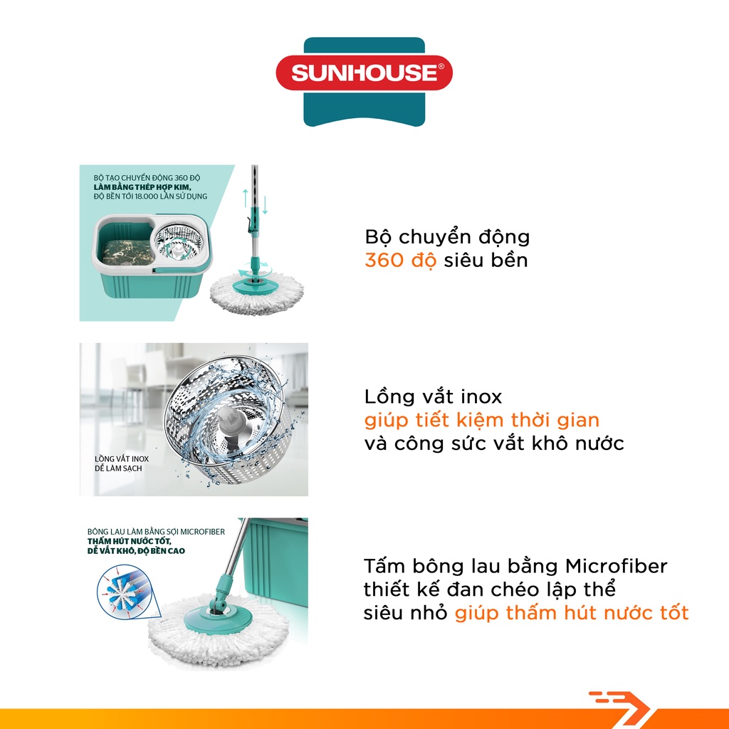 Sản phẩm Bộ lau nhà xoay 360 độ SUNHOUSE KS-CL330S bao gồm một thùng giặt có chứa lồng vắt và 1 cây lau. Với điểm nhấn là bộ tạo chuyển động 360 độ siêu bền, bộ lau nhà SUNHOUSE sẽ giúp bạn dễ dàng lau sạch bụi bẩn trong mọi ngóc ngách và cả những nơi khó lau dọn như gầm giường, gầm bàn, tủ, ghế… giữ cho ngôi nhà của bạn luôn sạch sẽ và thoáng mát.