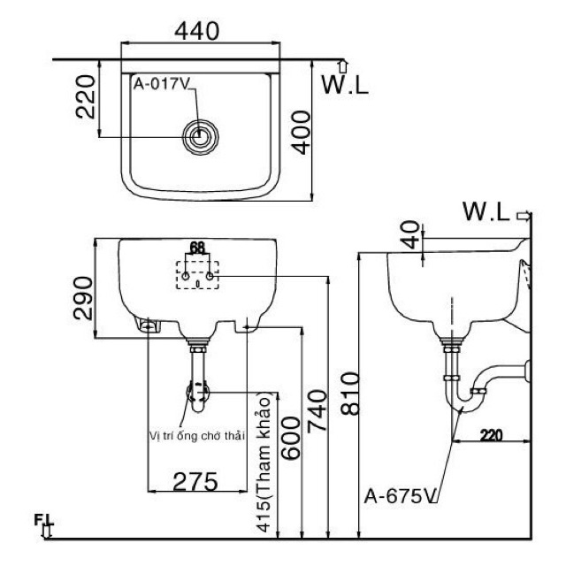 - Sản phẩm đã bao gồm nút chặn nước (A - 017V) và ống thải chữ P (A - 675PV).