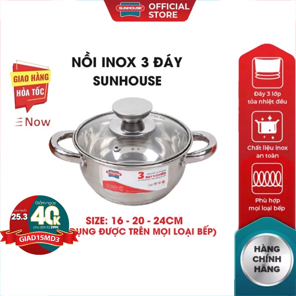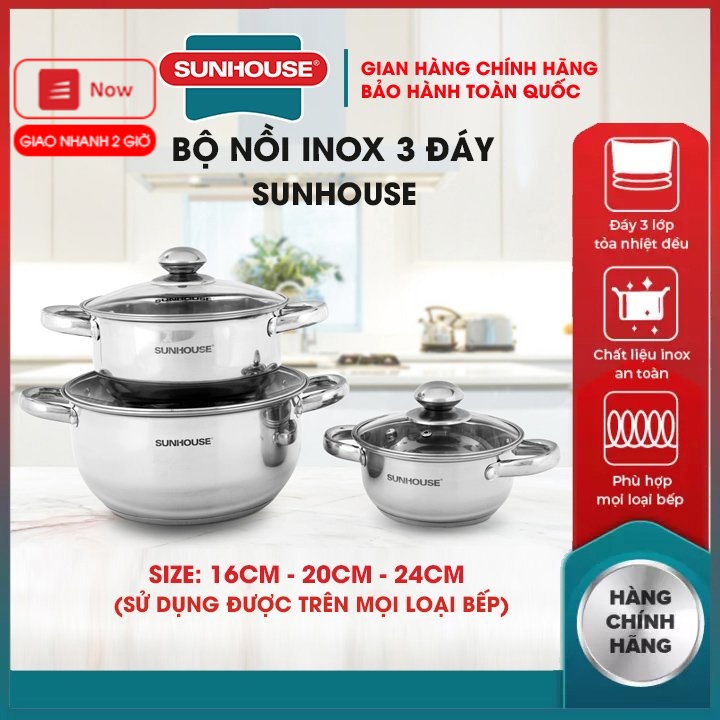 Nhà cửa & Đời sống > Dụng cụ nhà bếp > Nồi || Lẻ bộ nồi inox bếp từ 3 đáy cao cấp SUNHOUSE 16 20 24 CM hàng chính hãng bảo hành toàn quốcCòn hàng