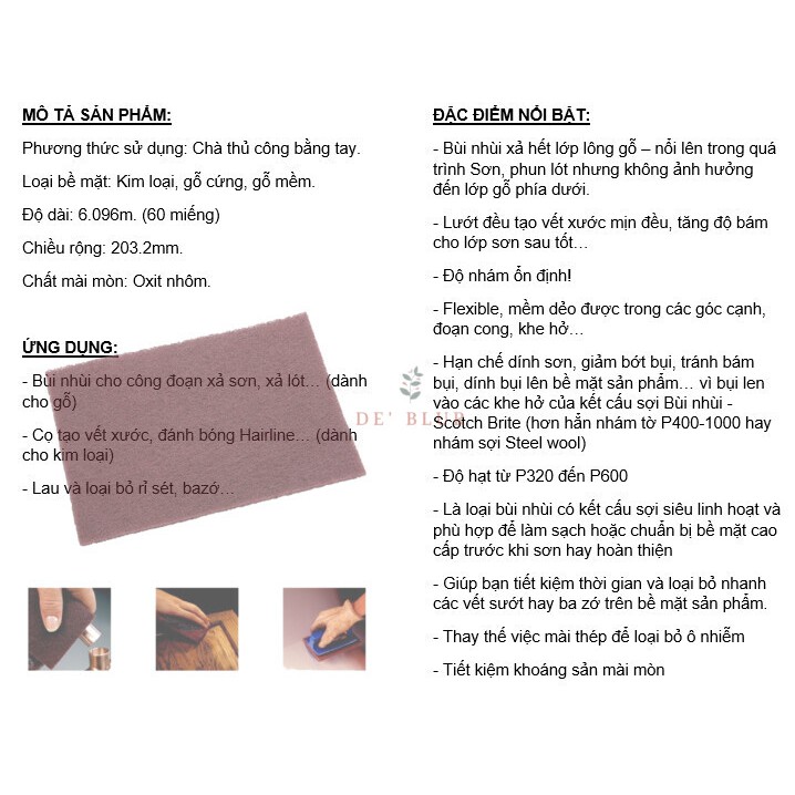 - Hạn chế dính sơn, giảm bớt bụi, tránh bám bụi, dính bụi lên bề mặt sản phẩm… vì bụi len vào các khe hở của kết cấu sợi Bùi nhùi - Scotch Brite (hơn hẳn nhám tờ P400-1000 hay nhám sợi Steel wool)
