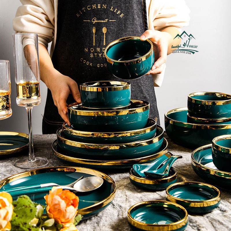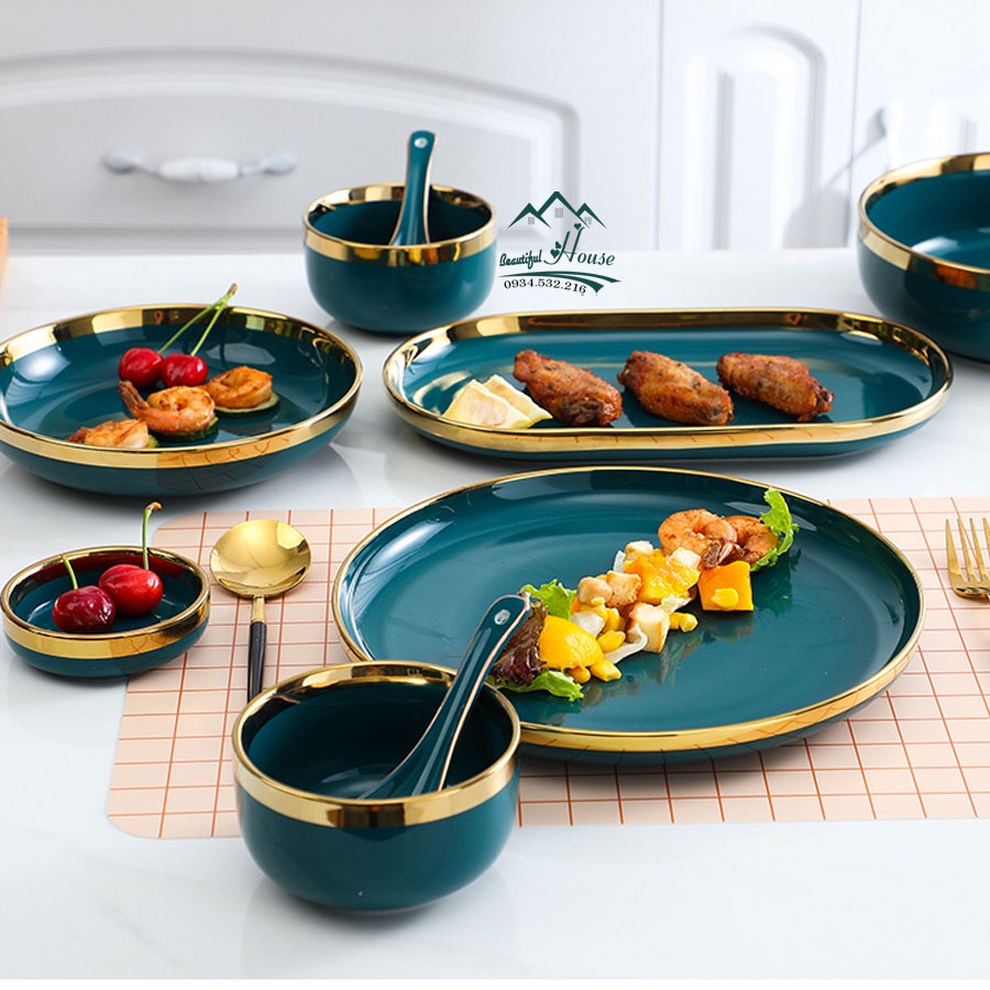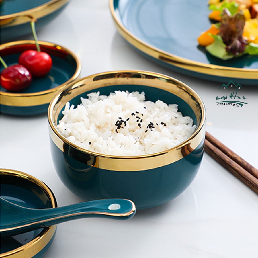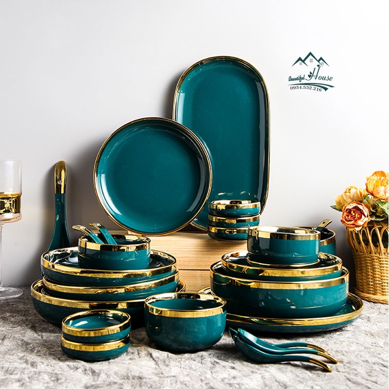 Bộ Bát Đĩa Sứ xanh cổ vịt - sứ cẩm thạch viền vàng 24k sang trọngGIỚI THIỆU: