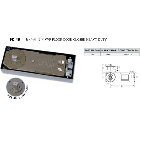Bản lề sàn VVP Thái Lan FC49 là một trong những loại bản lề cửa thủy lực được vận dụng phổ biến cho các loại cửa tại Việt Nam hiện nay. Bản lề sàn VVP Thái Lan FC49 với sức tải trọng lớn được sử dụng phổ biến cho các bộ cửa có kích thước to và nặng bản lề sàn FC49 đã thể hiện được những ưu điểm, tính năng vượt trội thông qua khả năng chịu trọng tải lớn, thích hợp cho hệ thống của kính thủy lực tại các showroom, trung tâm hội nghị, các nhà hàng…